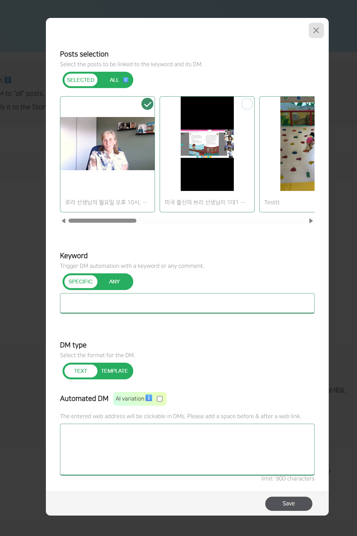 First, decide whether you want to apply DM automation to a specific post or to all posts. If you choose the specific post option, you can select multiple posts.Set Trigger Keywords: