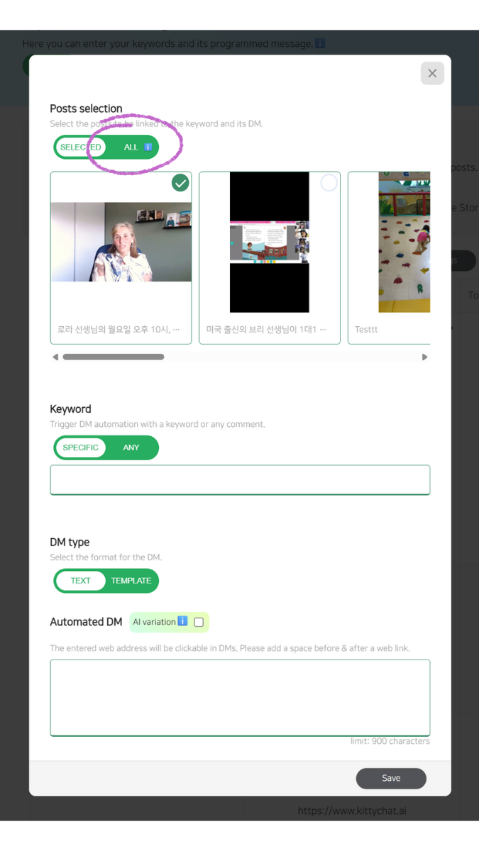When βAll Postsβ is selected, the Auto DM can also be triggered directly from the DM screen, not just from comments.